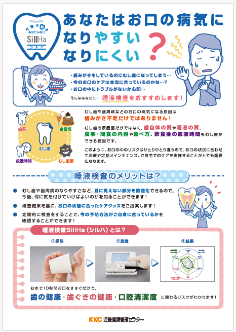 また、勉強会では、ご参加いただいた方のうち、ご希望された方にはKKCの健康づくりサービスの1つである、歯の健康リスクが分かる唾液検査「ShillHa(シルハ)」を体験いただきました。当日中に結果用紙をご返却し、KKCの歯科衛生士から簡単な説明を行ったのですが、大変興味深くご覧いただけた様子でした。