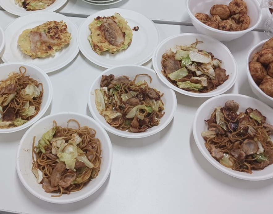 当日は、焼きそば・お好み焼き・たこせん・ホットドッグ・唐揚げなどの軽食に加え、クレープ・ヨーグルトアイス・スイカなどのデザートも用意。調理が始まると事務所内には美味しそうな香りが広がり、調理場を覗きに来る職員もいて、待ちきれない様子が伝わってきました。