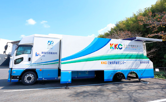 KKCは健康診断の会場設営の問題を軽減するため、いち早く特殊健診車両の自社開発に取り組んできました。現在KKCが保有する特殊健診車両は約50台。胸部・胃部X線車、婦人科健診車、THP車や総合健診車などがあります。そのいずれもが、長年の経験と健診現場でのノウハウを結集し、受診者の立場に立った独自の設計で製作されたものです。細やかな配慮と強力なフットワークは、他にはないKKCの特徴です。